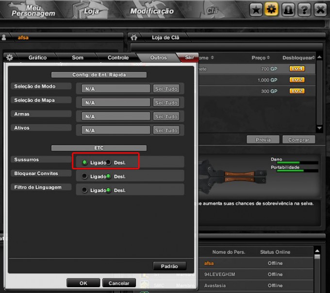 Quando se instala o Combat Arms ele pode vim tanto ativado como desativado, para saber se esta ativado va em: Configurações > Outros > Sussurros marque a opção Ligado caso esta Del.